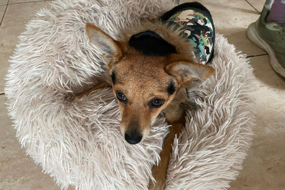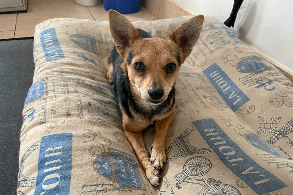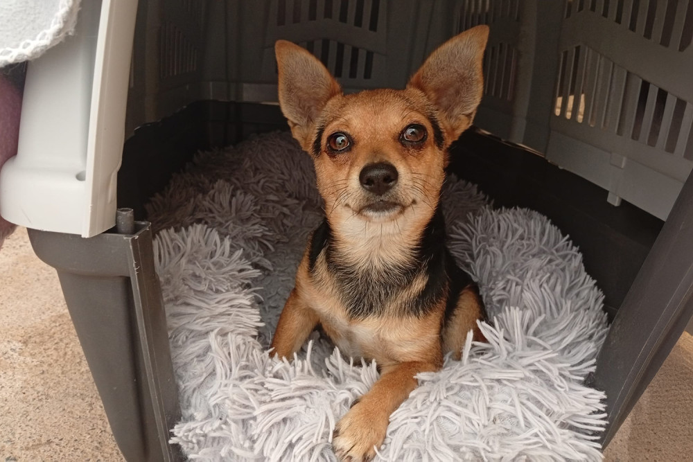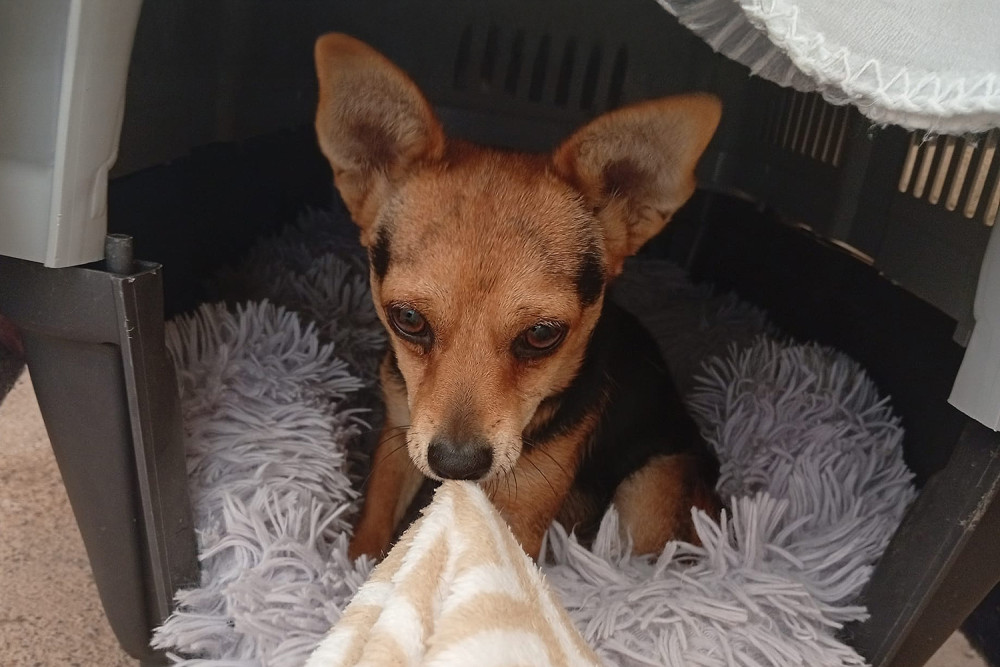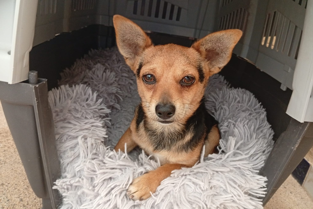 Pinky es un macho de capa negra y fuego que llegó al refugio el 11 de noviembre de 2025. Fue visto y rescatado por dos de nuestros voluntarios al lado de una carretera. Lo impactante de este rescate fue comprobar como Pinky permanecía inmóvil en el lugar, dándole golpes con una de sus patas a otra perra que yacía muerta a su lado, intentando despertarla, y que acababa de ser víctima de un atropello. No quería irse de allí sin su compañera, por la que nada pudimos hacer. Por desgracia esa era la misma suerte que hubiera corrido él de no haber sido rescatado.